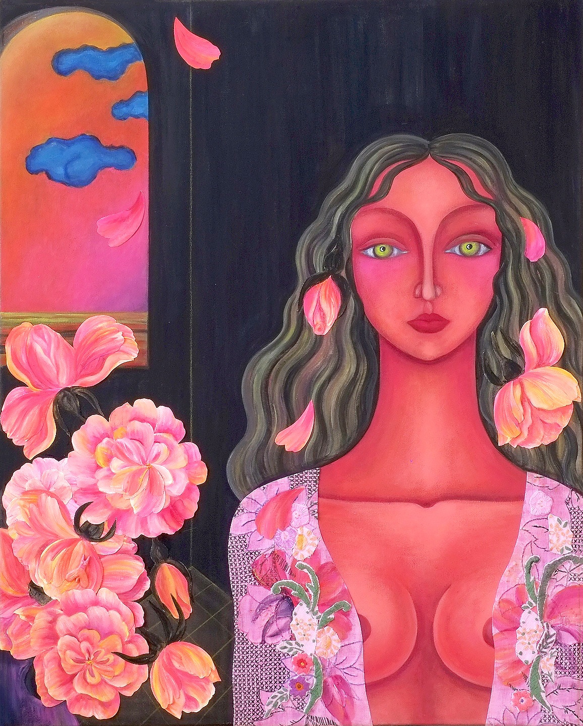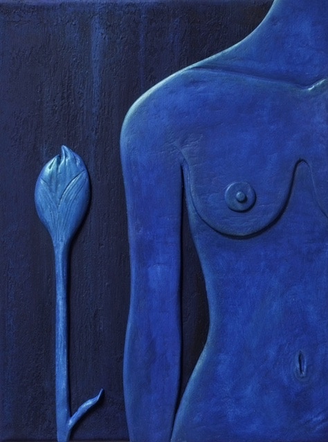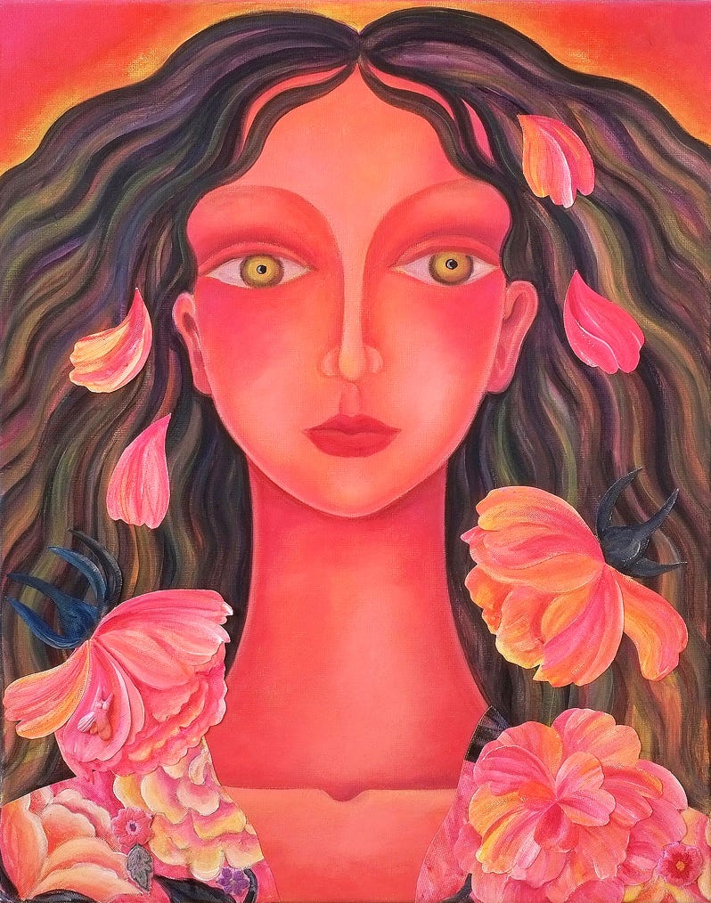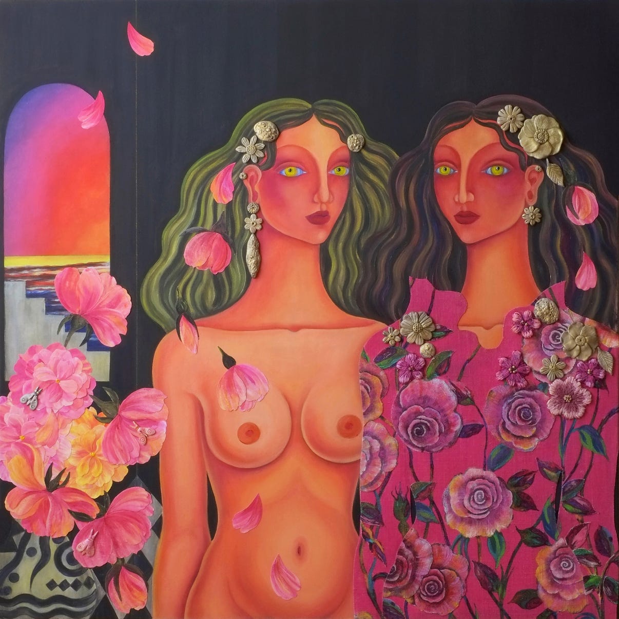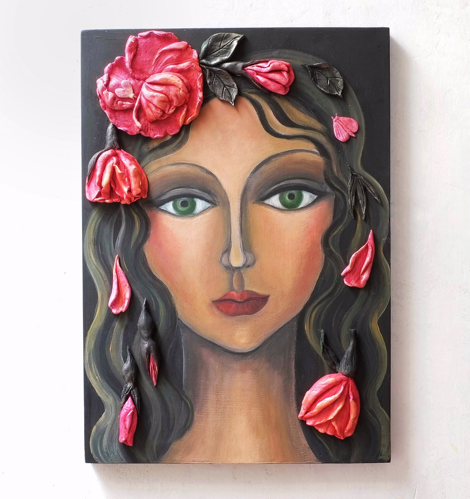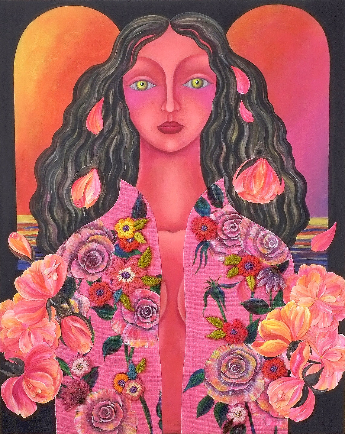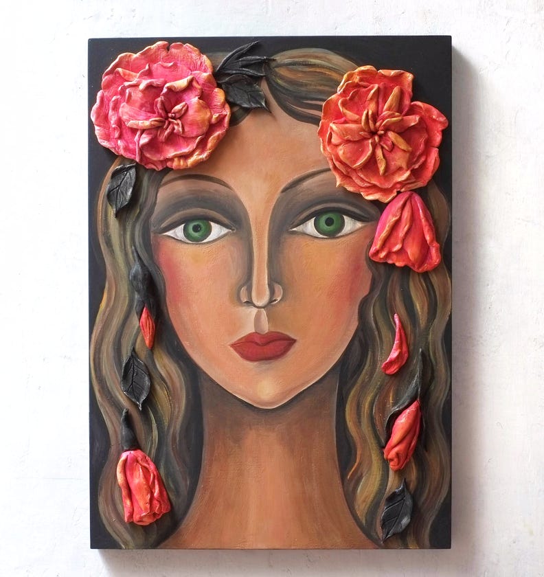 Acrylic and oil paints, fabric, yarns, beads, clay.