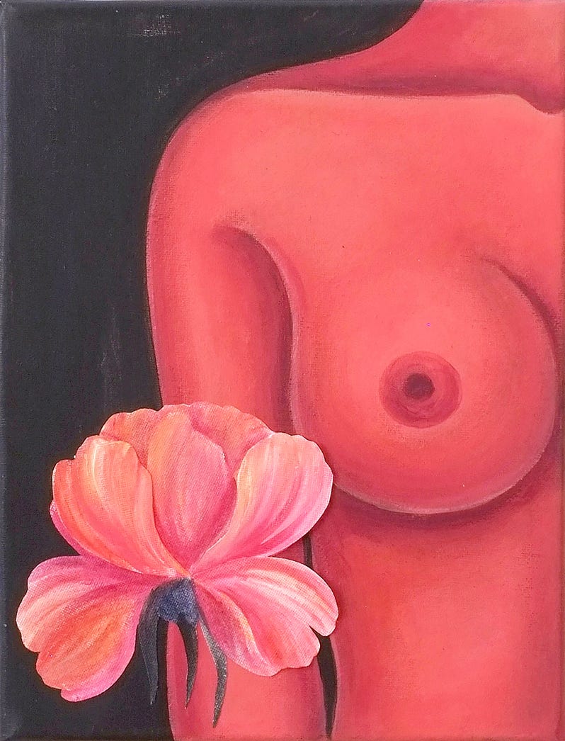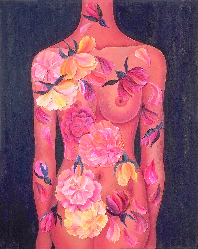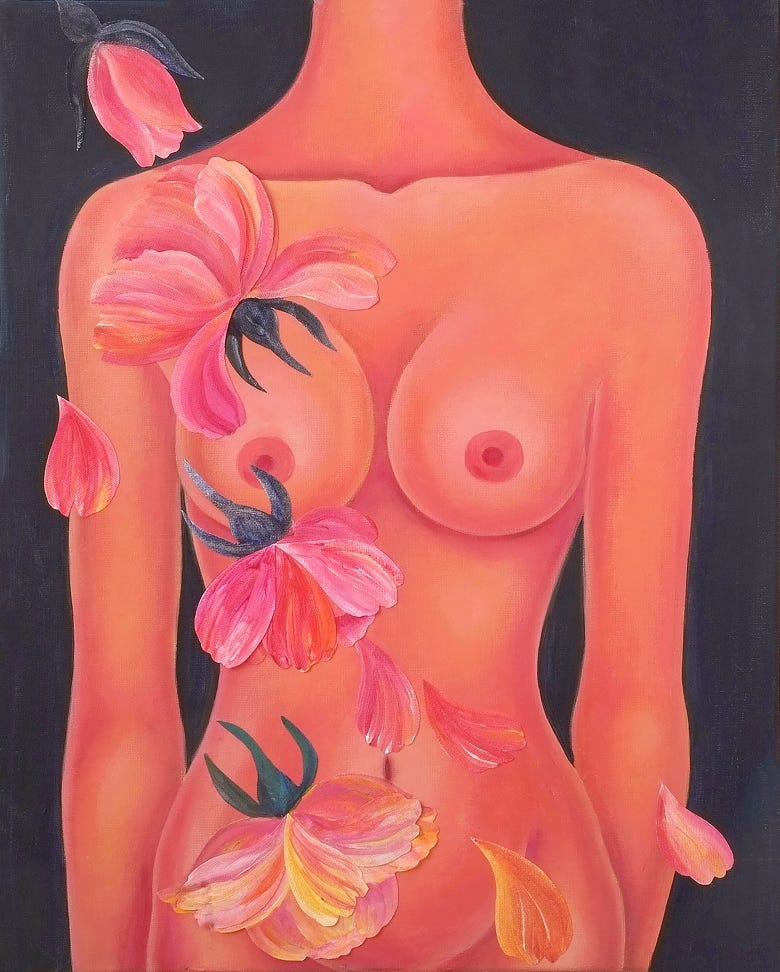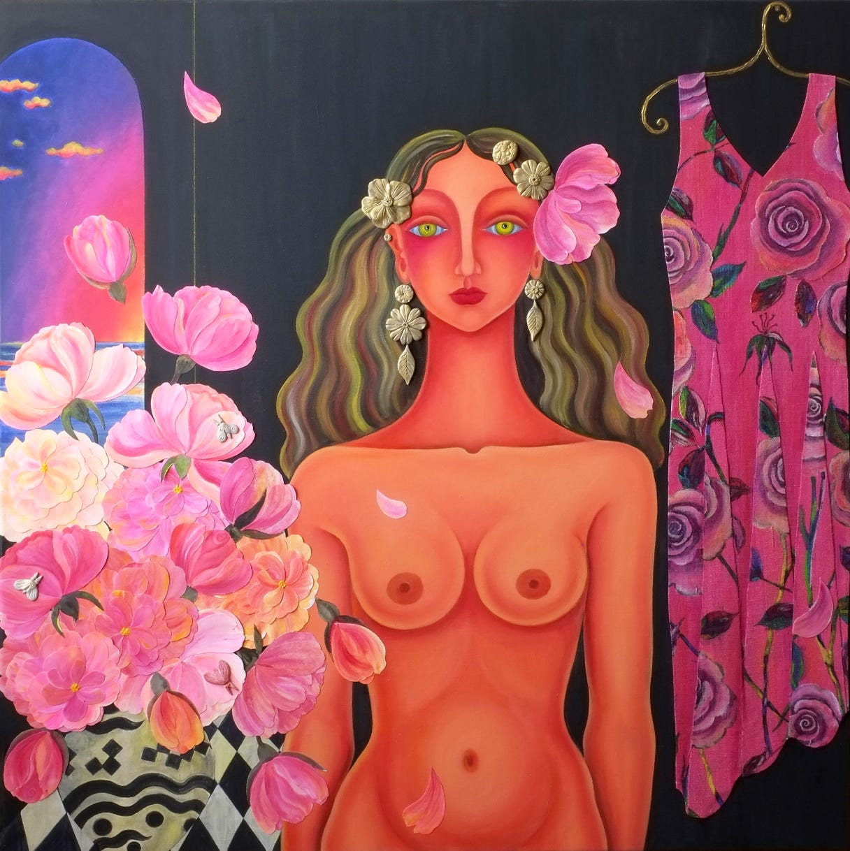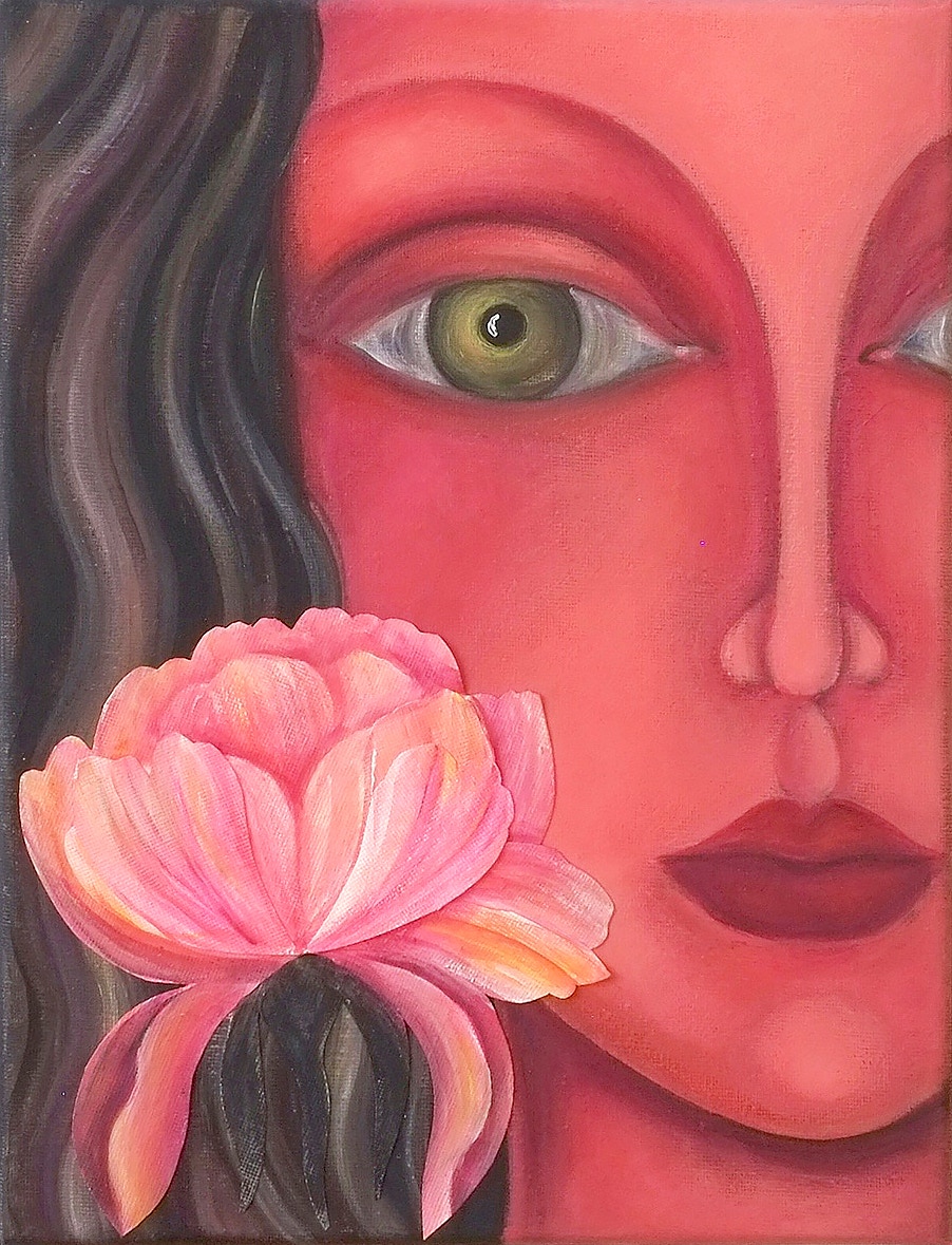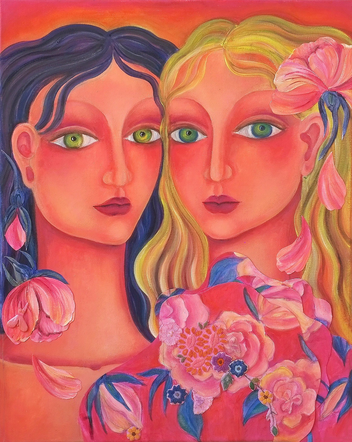 Acrylic and oil paints, fabric, yarns, beads, clay.