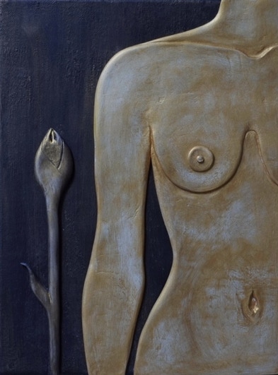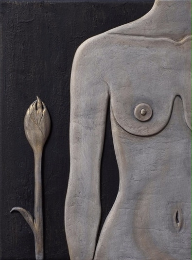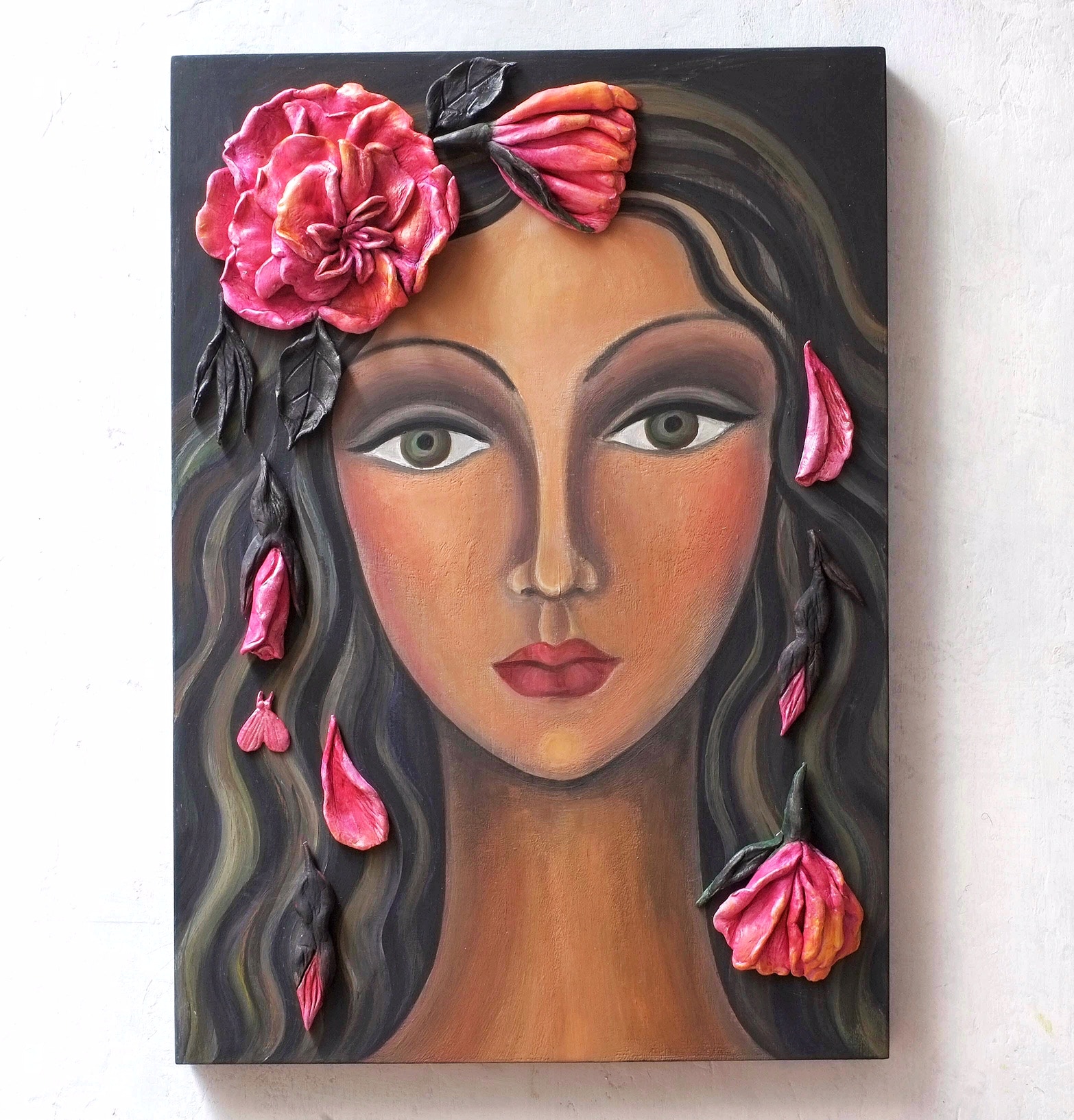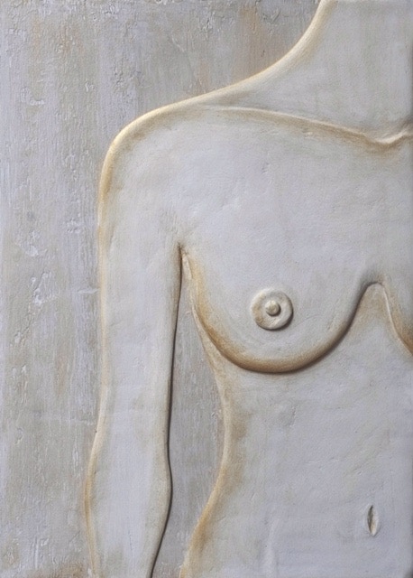 Air dry clay, acrylic relief appliquéd on canvas panel.